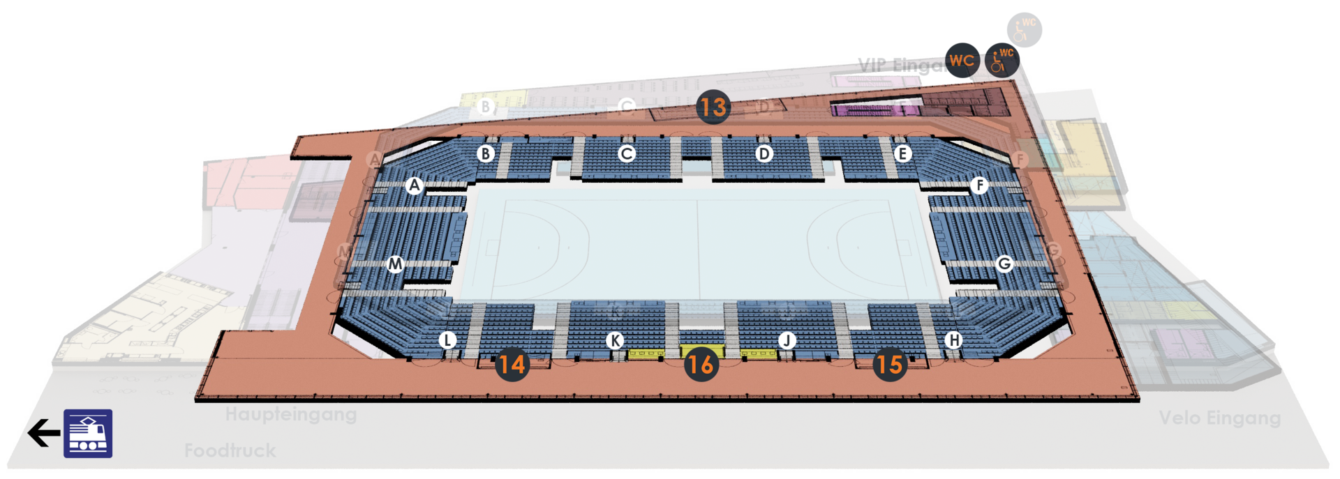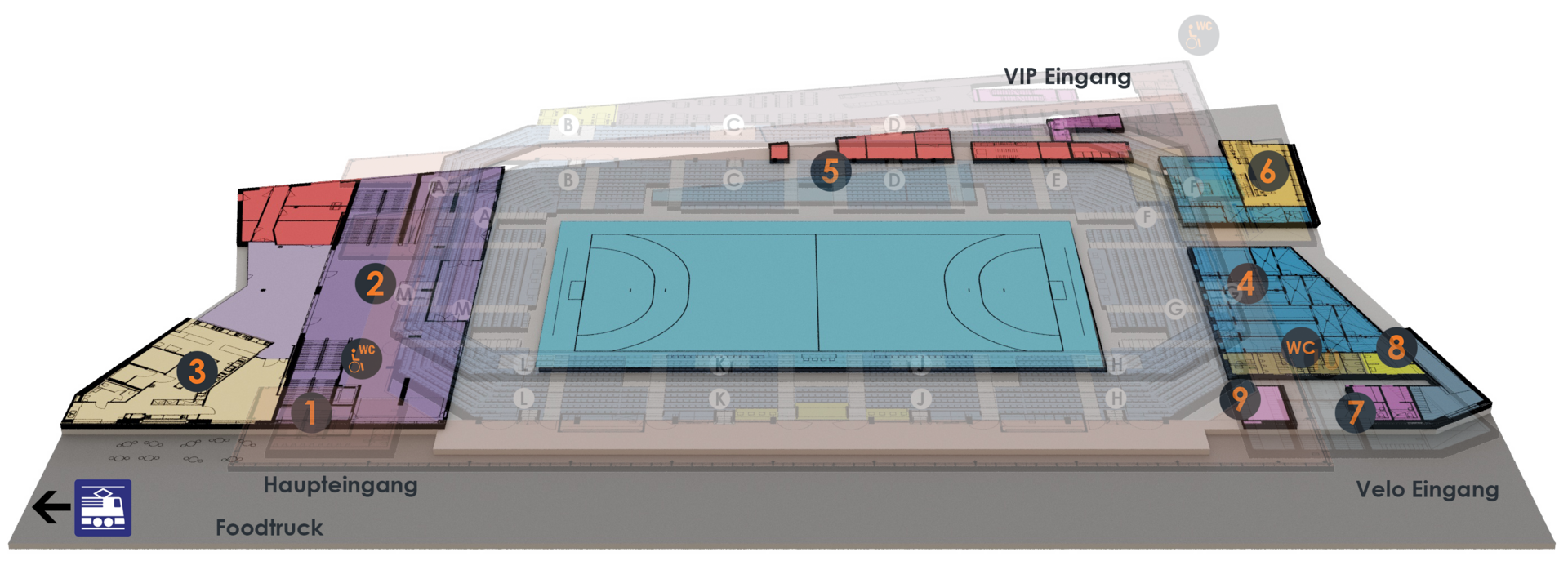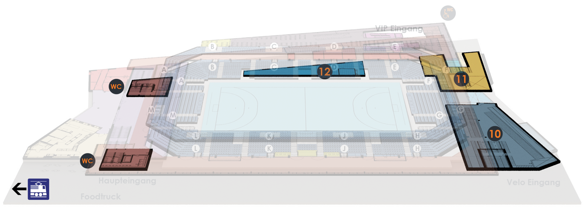 Finden Sie alle relevanten Räume in den verschiedenen Schnitt-Schemas. Ob die Besuchenden vom Bahnhof, mit dem Velo oder auch mit dem PW anreisen, die Orientierung auf dem PILATUS ARENA Areal ist gegeben.