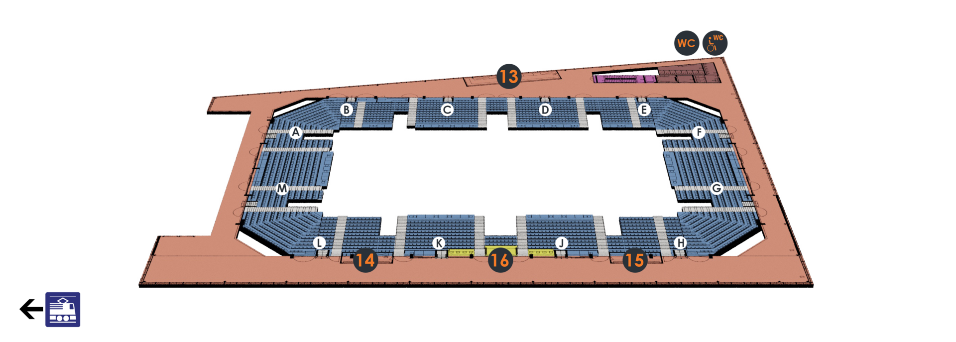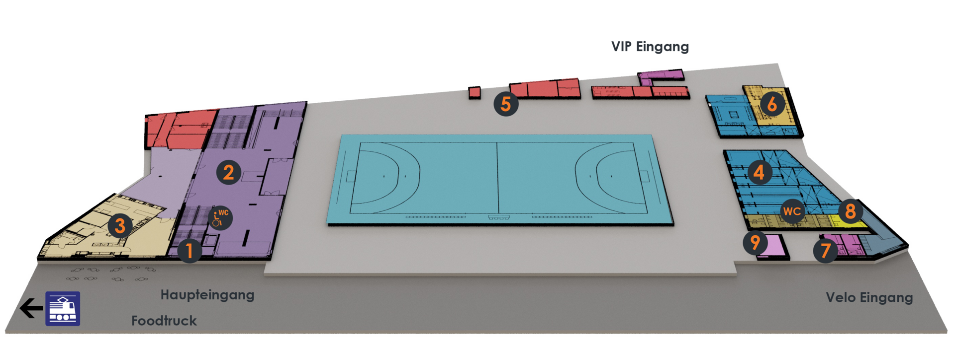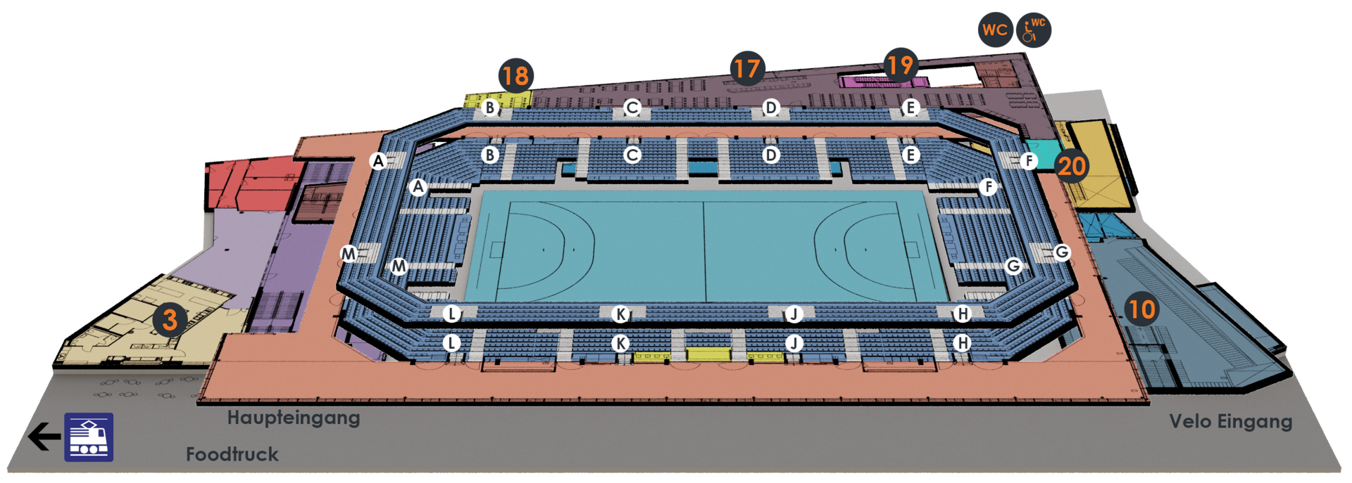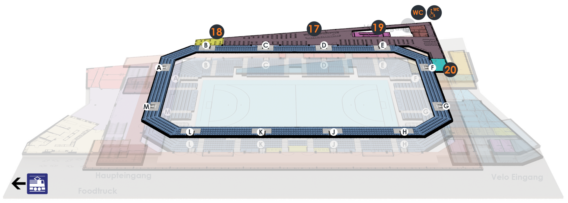 Finden Sie alle relevanten Räume in den verschiedenen Schnitt-Schemas. Ob die Besuchenden vom Bahnhof, mit dem Velo oder auch mit dem PW anreisen, die Orientierung auf dem PILATUS ARENA Areal ist gegeben.